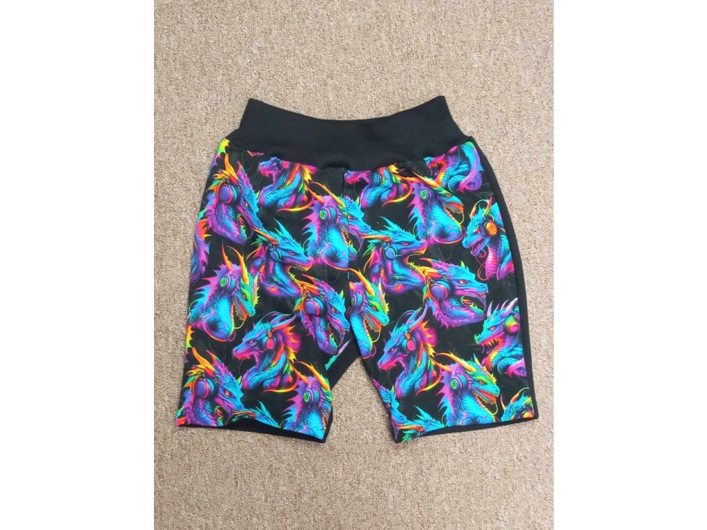 Univerzální kraťásky ušité z teplákoviny BAREVNÍ DRACI digi tisk, zadní díl černá, kalhotového střihu. V pase náplet s gumou.