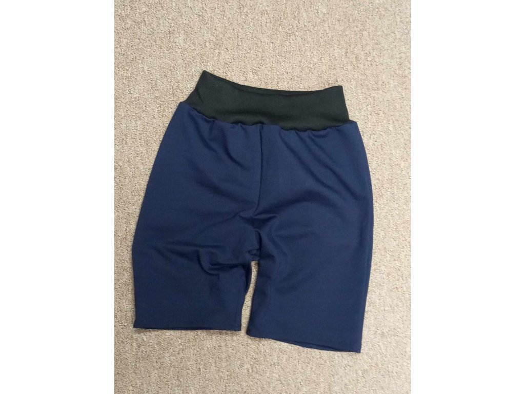 Univerzální kraťásky ušité z teplákoviny čistě jednobarevné NAVY kalhotového střihu. V pase náplet s gumou.