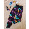 Tepláčky ušité z teplákoviny digi tiskem krásných kočiček na černém podkladě kalhotového střihu s černými žebro náplety.