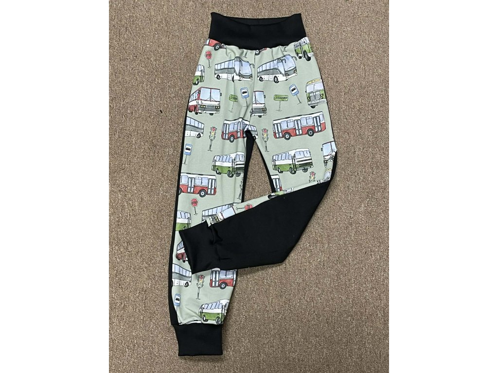Tepláčky ušité z přední části digi tisk autobusy na mint, zadní díl černá kalhotového střihu s černými žebrovými náplety.