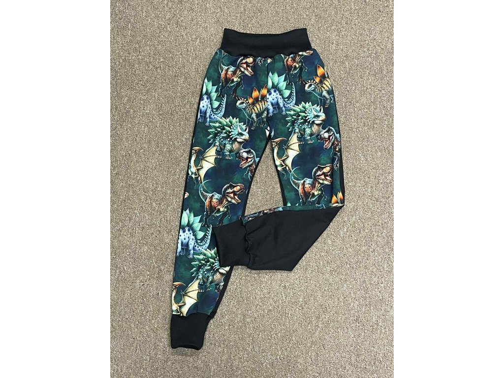 Tepláčky ušité z přední části vzorované pestré teplákoviny dinosauři na tmavě zelené, zadní díl černá kalhotového střihu s černými žebrovými náplety.