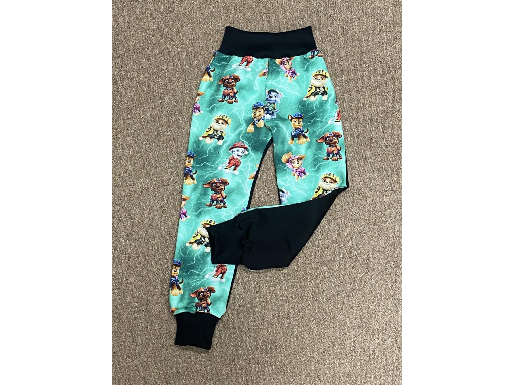 Tepláčky ušité z přední části digi tisk patrolka mintová, zadní díl černá kalhotového střihu s černými žebrovými náplety.