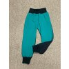 Tepláčky ušité z přední části jednobarevné teplákoviny petrolejové, zadní díl černá kalhotového střihu s černými žebrovými náplety.