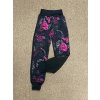 Tepláčky ušité z teplákoviny s divokými růžemi a motýli, zadní díl jednobarevná černá kalhotového střihu s černými žebrovými náplety.
