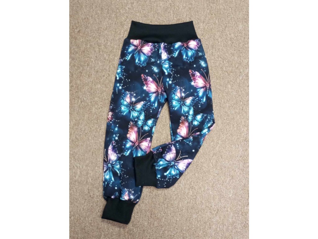 Tepláčky ušité z teplákoviny digi tisk krásní velcí motýli kalhotového střihu s černými žebrovými náplety.